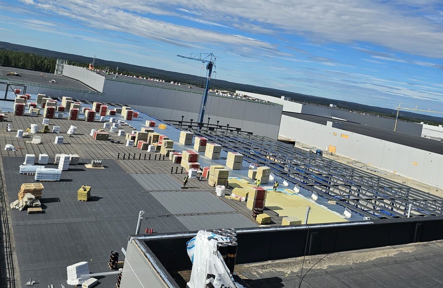 Northvolt Ett is one of the largest battery factories in Europe, located in the town of Skellefteå, Sweden. It specializes in the production of eco-friendly lithium-ion batteries for electric vehicles and energy storage. The factory spans 500,000 square meters, with an annual production capacity expected to reach 60 GWh. Our team was involved in a roof insulation and waterproofing project at this factory.